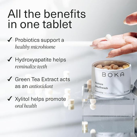 Boka Travel Size Mouthwash Tablets - Hydroxyapatite, Fluoride Free & Alcohol Free - Chewable Tablets to Freshen Breath, Kill Odor Quickly - (90 Pcs, Mint)