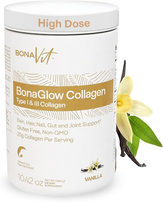BonaGlow - Hydrolyzed Collagen Powder - Vanilla Flavor - 24 Servings - Type I & III with Vitamin C, Probiotics, and Digestive Enzymes - Skin, Nails, Hair - High Dosis of Collagen & Protein