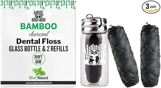 BOONBOO Dental Floss, Bamboo Charcoal Woven Thread, Glass Bottle + 3 Spools, Total 300FT/90M, Waxed, Coconut