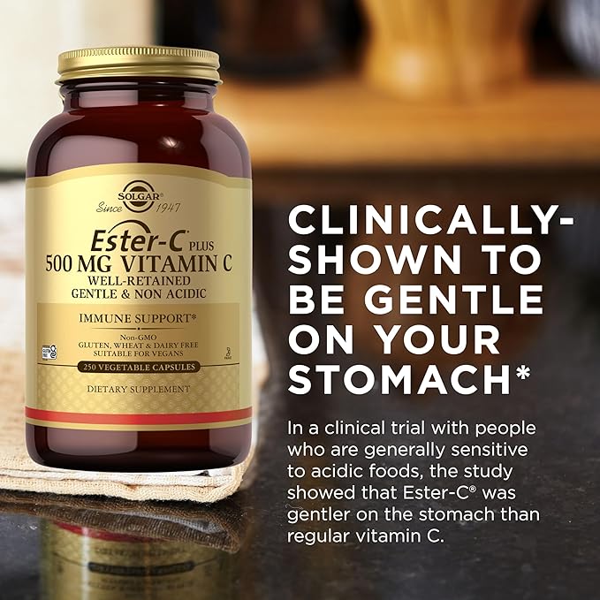 - Immune Support & More; Solgar Ester-C Plus 500 mg Vitamin C Vegetable Capsules also contribute to collagen formation for healthy skin and cartilage; Increases iron absorption
