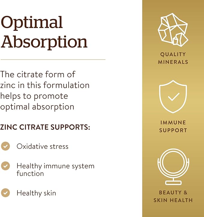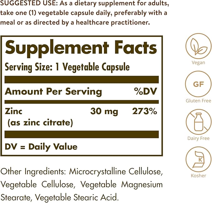 - Optimal Absorption; Solgar Zinc Citrate contains the citrate form of zinc to help promote optimal absorption; The 30 mg of zinc in this formulation represents 273% of the recommended daily value