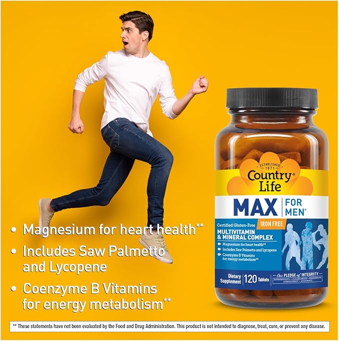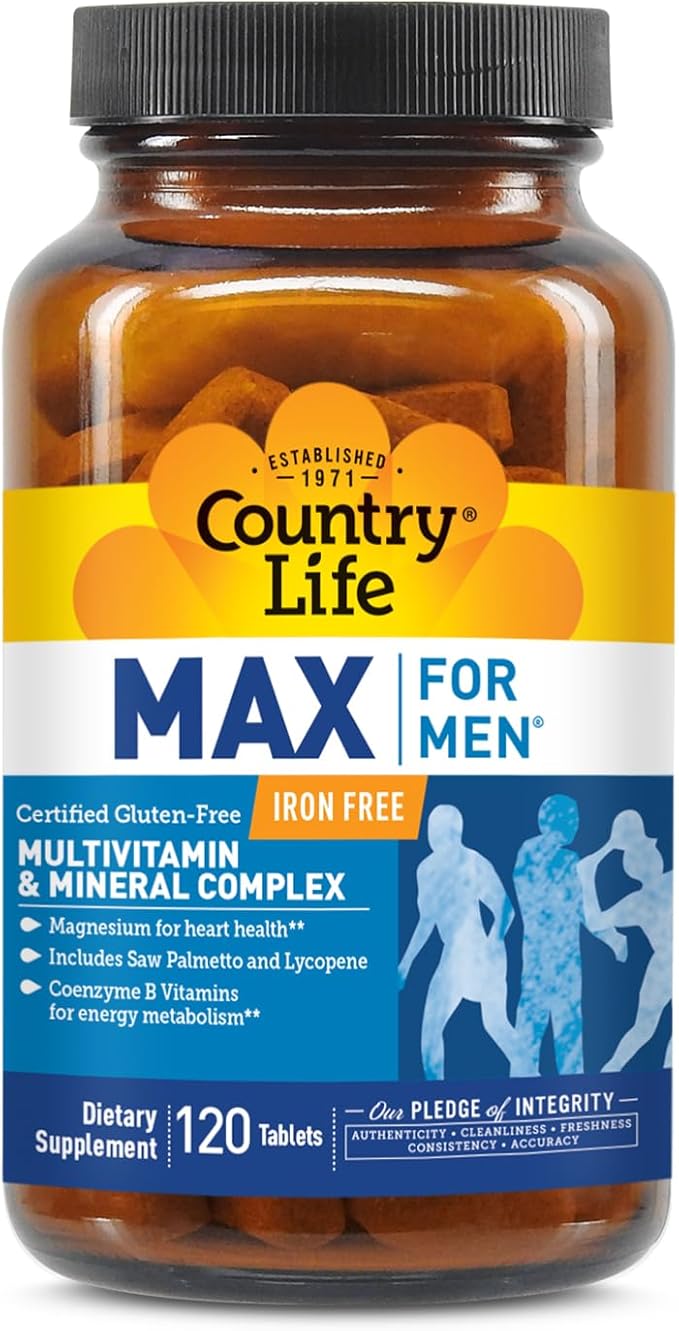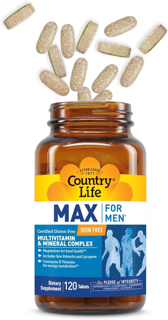 Country Life Max for Men Multivitamin: Iron-Free, Gluten Free, Saw Palmetto, Lycopene, Daily Support for Energy, Heart & Men's Health,120 Vegetarian Tablets