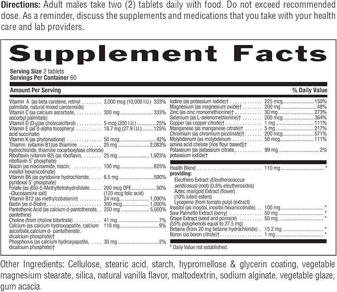 - DOSAGE AND GUIDANCE: Adult males take two (2) Iron-Free Multivitamin tablets daily with food. Do not exceed the recommended dose. Consult your healthcare provider about any supplements or medications you take.