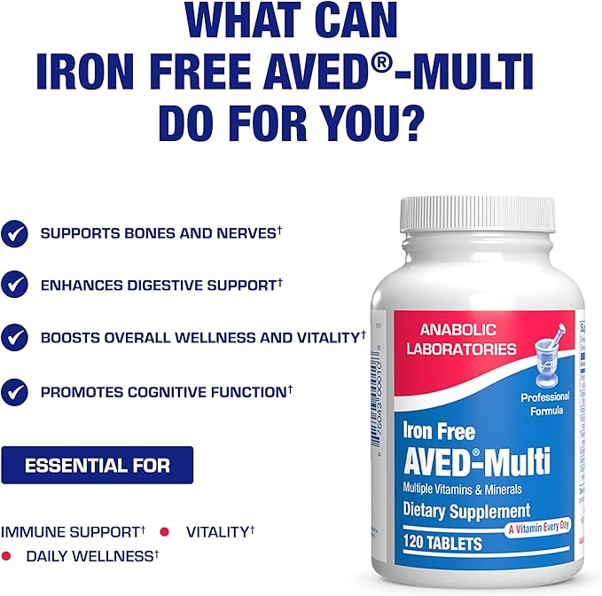 Iron Free Daily Multivitamin for Men and Women, 120 Tablets - AVED Daily Multi Vitamin and Minerals Health Supplement - Vitamins A, C, D, E, Vitamin B Complex, Zinc, Calcium, Magnesium, More