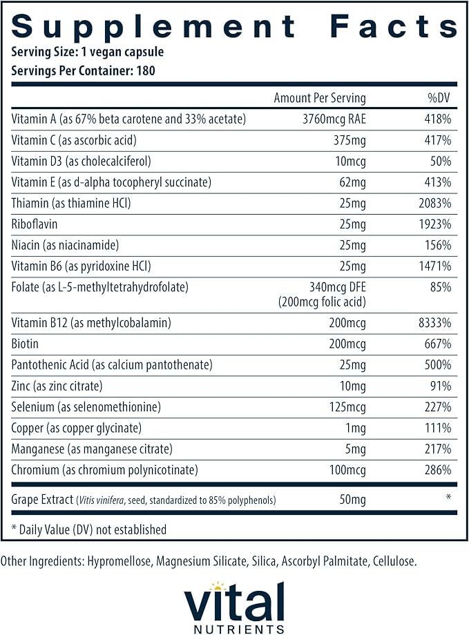 Vital Nutrients Minimal and Essential Multivitamin | Vegetarian One per Day Multi Vitamin, Mineral, & Antioxidant Supplement* | Iron-Free | Gluten, Dairy, Soy Free | Non-GMO | 180 Capsules