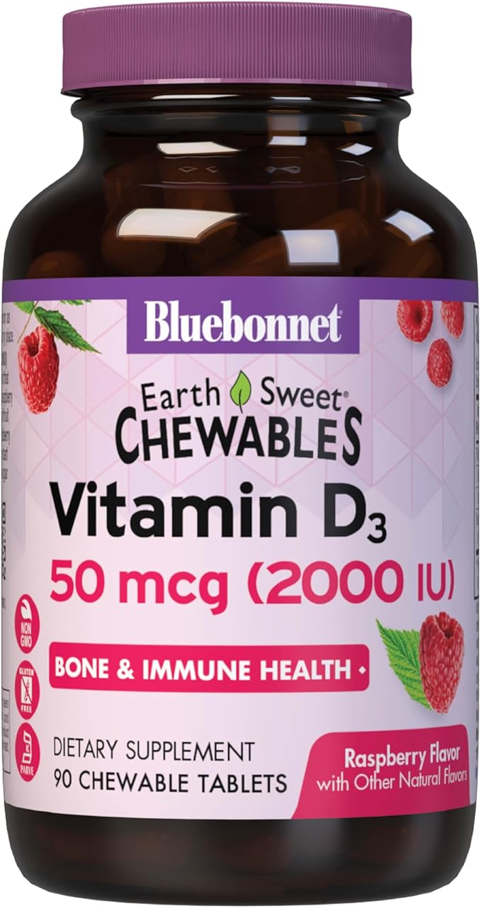 Bluebonnet Nutrition Earth Sweet Vitamin D3 2000 IU Chewable Tablets, Aids in Muscle and Skeletal Growth, D3, Non GMO, Gluten, Free, Soy Free, Milk Free, Kosher, 90 Chewable Tablets, Raspberry Flavor