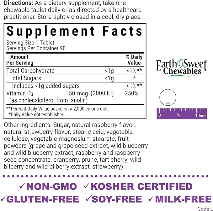 - These raspberry flavored, chewable tablets contain 2000 IU of Vitamin D3 from Lanolin and is Sweetened with EarthSweet
