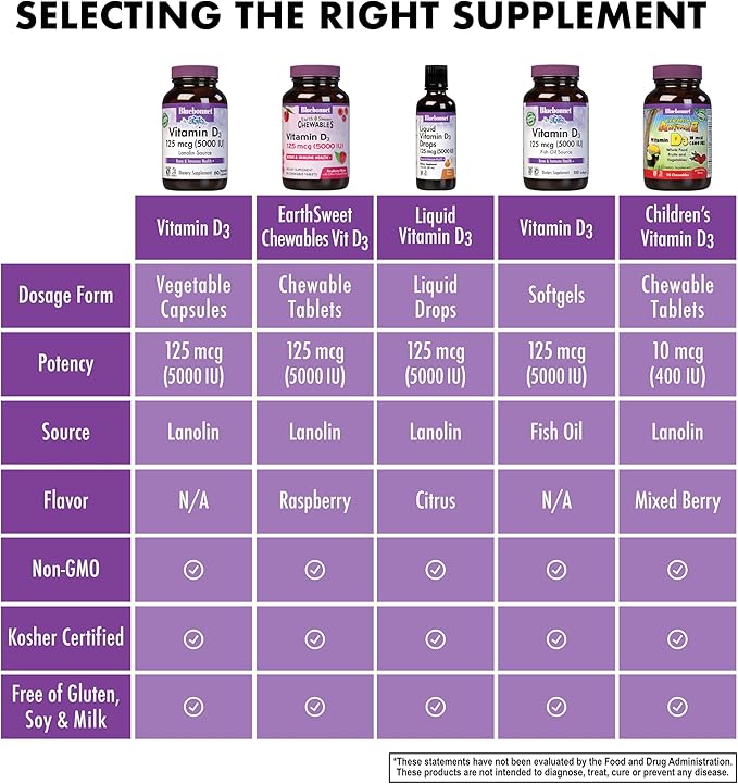 Bluebonnet Nutrition Vitamin D3 5000 IU Vegetable Capsule, Aids in Muscle & Skeletal Growth, Cholecalciferol from Lanolin, D3, Non GMO, Gluten Free, Soy Free, Milk Free, Kosher, 60 Count