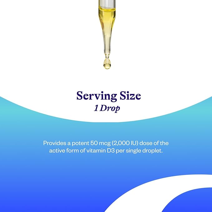 - Easy-to-take: 1 drop provides 50mcg (2,000 IU) of liquid vitamin D3 (as cholecalciferol). Only one drop by mouth daily is needed