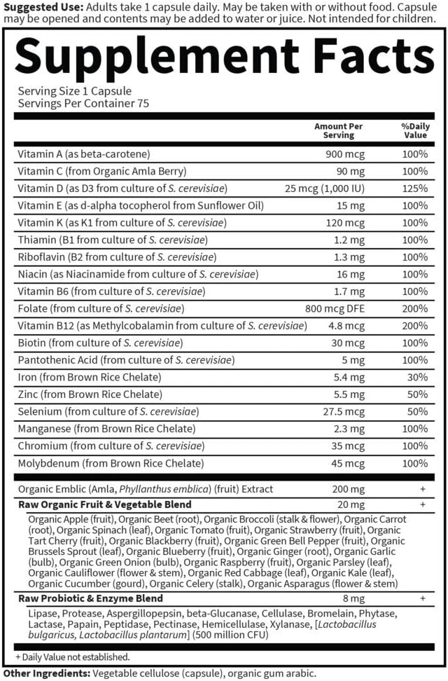 - MULTIVITAMIN WITH PROBIOTICS & WHOLE FOODS: One a day women's vitamins support energy, metabolism as well as radiant skin and nails; 24 powdered organically grown raw fruits and vegetables add supporting antioxidants, vitamins & nutrient cofactors