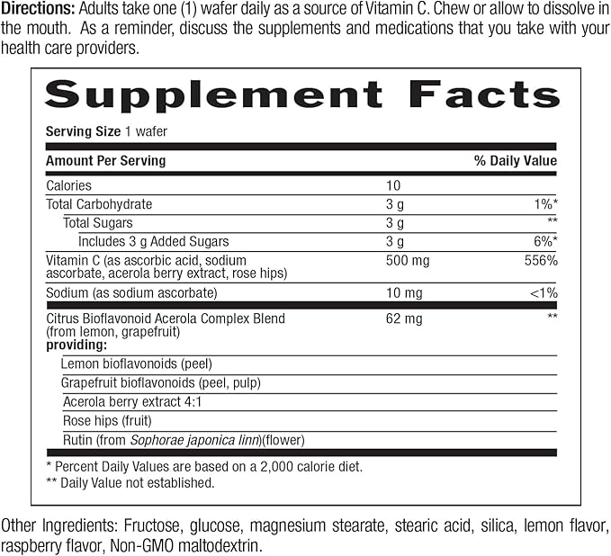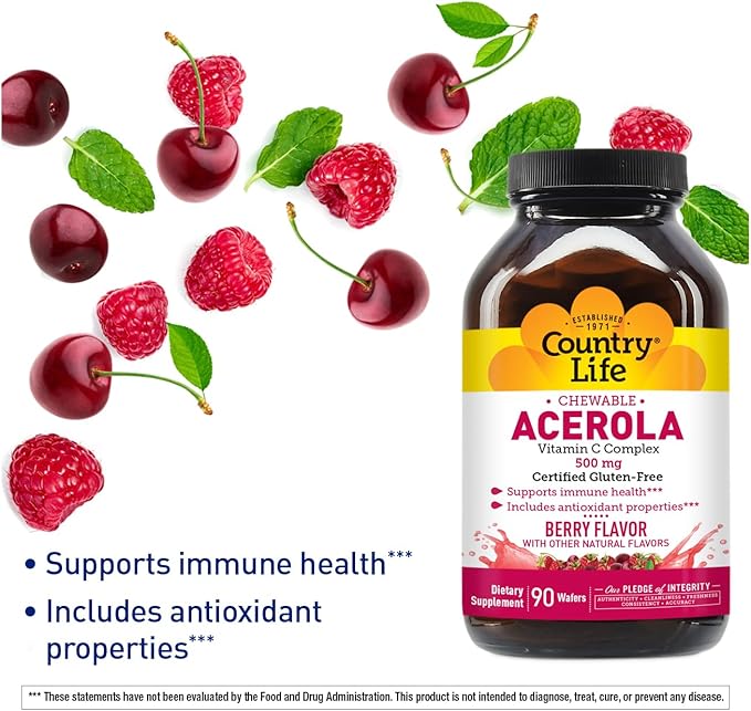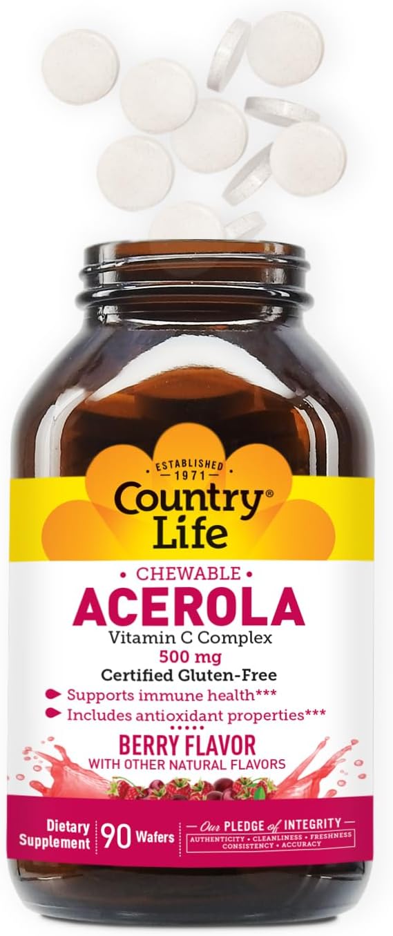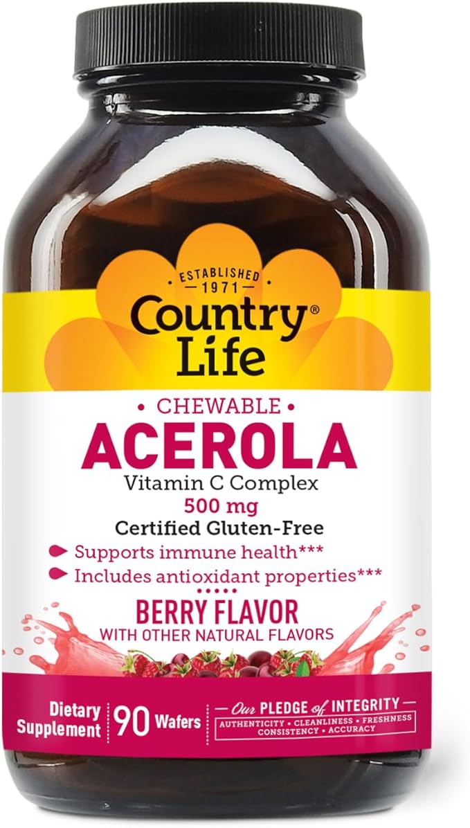 Country Life Acerola Vitamin C Complex, 500mg, Chewable Berry Flavored Wafers, Supports Immune Health, 90 Wafers, Certified Gluten Free by GFCO, Certified Vegan by AVA