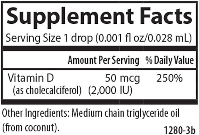 - 2,000 IU (50 mcg) of concentrated vitamin D3 in a single liquid drop