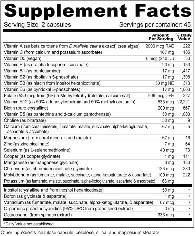 - DAILY ENERGY MULTIPLE VITAMIN -27 ESSENTIAL NUTRIENTS: Includes beta carotene, methylated b complex vitamins, vitamin C, vitamin D, vitamin E, folate, calcium, magnesium, zinc, selenium & more. Two capsules of this one multivitamin provide foundational nutrition.