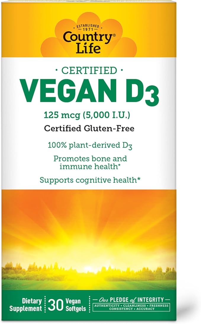 Country Life Vegan D3 5000 IU – Plant-Derived Vitamin D3 from Lichen – High Potency Immune & Bone Support – Certified Vegan, Gluten-Free, Non-GMO – 30 Softgels