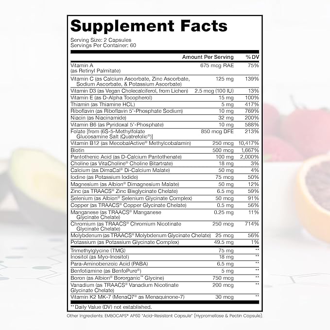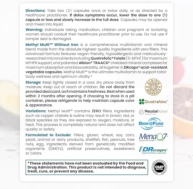 - πππππππ ππππππππππ: When supplementing, absorption is key! Methyl Multi without Iron is formulated with Quatrefolic Folate (5-MTHF), Albion TRAACS mineral chelates, and other micronutrients in their pre-methylated and coenzyme forms for optimal absorption and bioavailability, all together in DRcaps acid resistant vegetable capsules.
