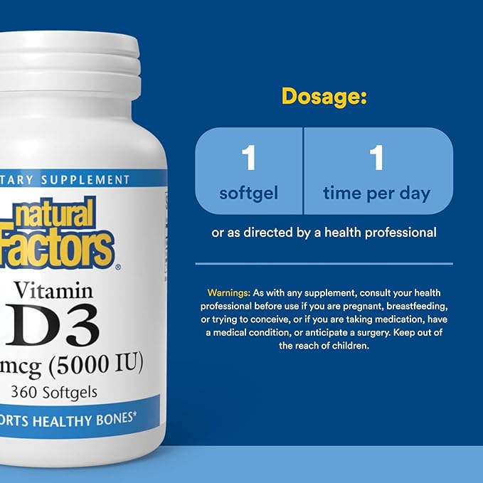 Natural Factors, Vitamin D3 5000 IU (125 mcg), Supports Strong Bones, Muscles and Immune Function, 360 Softgels