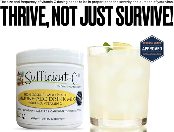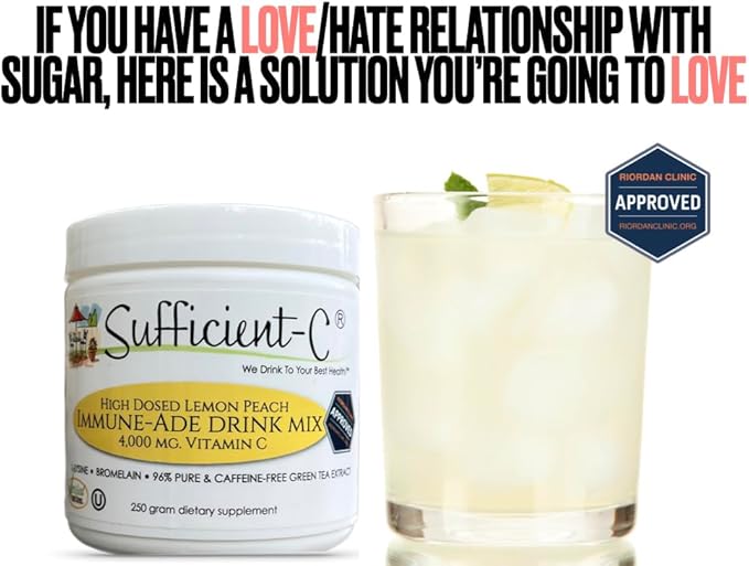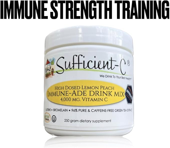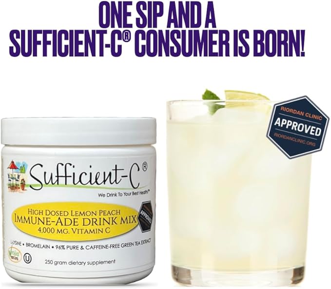 Sufficient-C High-Dosed 4000 mg. Vitamin C Lemon Peach Immune-Ade Drink Mix 250 gram Size - Refreshing with Generously Dosed L-lysine, Bromelain & 96% Pure, Caffeine-Free Green Tea Extract
