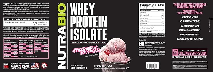 NutraBio 100% Whey Protein Isolate Protein Powder, 25g Protein with Complete Amino Acid Profile, Non-GMO, Soy & Gluten Free, Low Carb, Low Calorie Whey Protein Powder, Strawberry Ice Cream, 2 Lbs