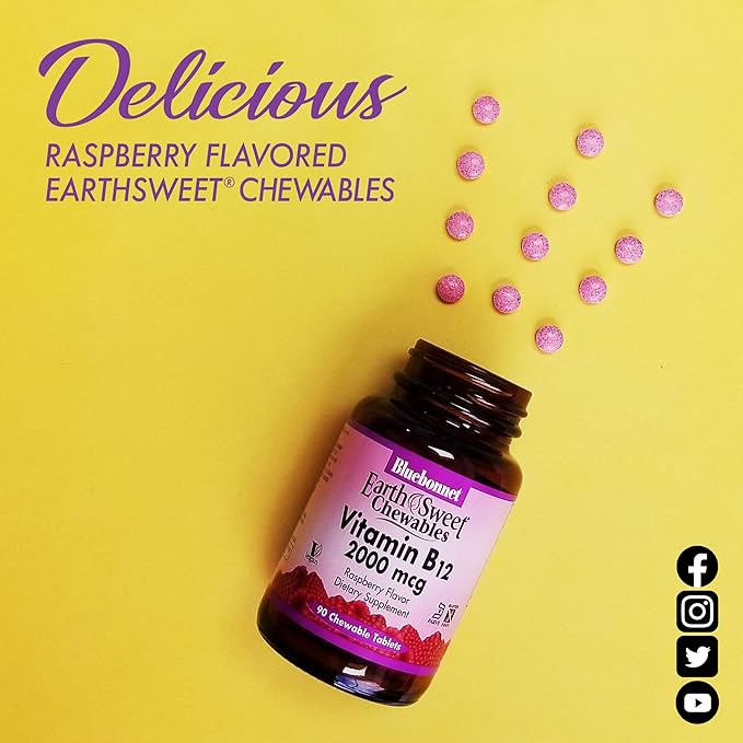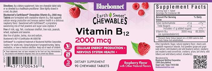 BlueBonnet Nutrition Earth Sweet Vitamin B12 2000 mcg Chewable Tablets, Soy-Free, Gluten-Free, Kosher Certified, Dairy-Free, Vegan, Raspberry Flavored, 90 Chewable Tablets, 90 Servings