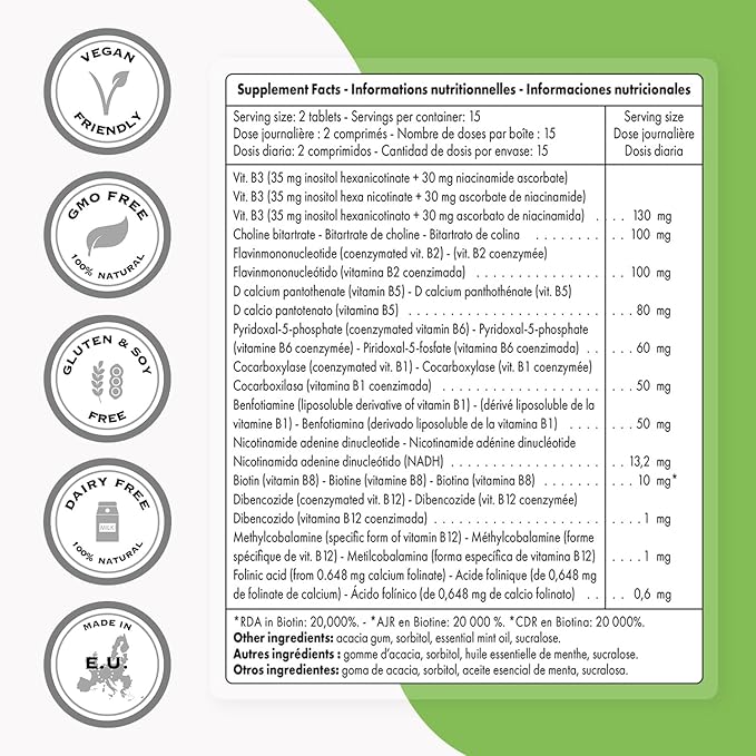 - π¬ CONTAIN: Vitamine B3, Choline bitartrate, Flavin mononuclotide, D calcium pantothenate, Pyridoxal-5-phosphate, Cocarboxylase, Benfotiamine, NADH, Biotin, Dibencozide, Methylcobalamin, Folinic acid | Other ingredients : Acacia gum, sorbitol, mint essential oil, sucralose.
