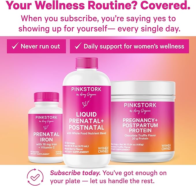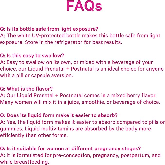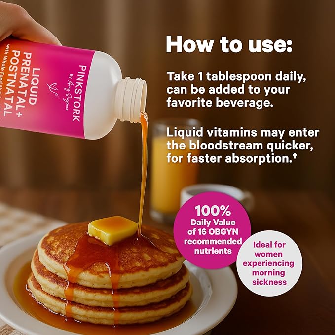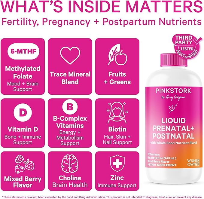 - Liquid Multivitamin: Pink Stork Liquid Prenatal + Postnatal multivitamin and mineral blend features 100% of 14 OBGYN-recommended vitamins from organic, whole-food blends, including real Folate (the natural form of Folic Acid), Vitamin C, Vitamin D, B Complex vitamins (including vitamin B6 and vitamin B12), Vitamin E, Zinc, and more. Liquid multivitamins are absorbed by the body more efficiently than prenatal vitamin gummies or capsule supplements - continue as your Postnatal Vitamin of choice!