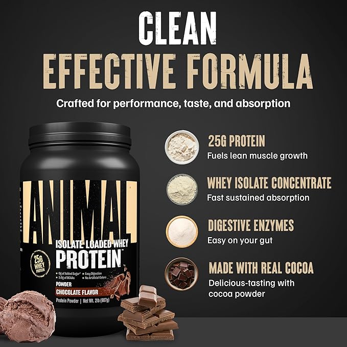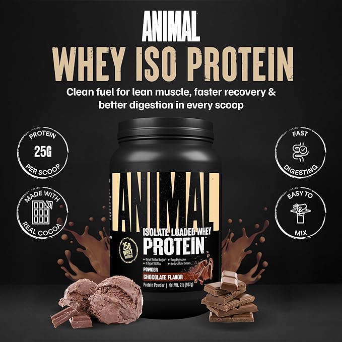 Animal Whey Isolate Protein Powder - Loaded for Pre & Post Workout Muscle Builder and Recovery with Digestive Enzymes for Men & Women - 25g Protein, Great Taste, Low Sugar - Chocolate 2 lbs