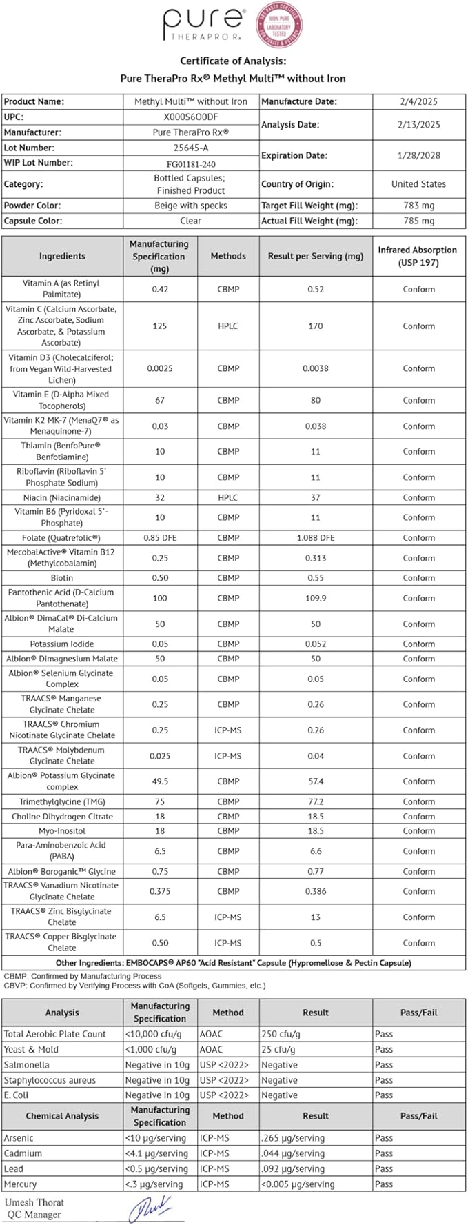 - ππ πππππ πππππ πππππππππππ: Pure TheraPro Rx Methyl Multi without Iron contain no fillers such as rice flour, cornstarch, or wood pulp fibers. Our manufacturing facility adheres to strict NSF/cGMP guidelines. Consumer safety and satisfaction are our highest priority, which is why our products undergo rigorous third-party testing and screening to ensure product purity and potency.