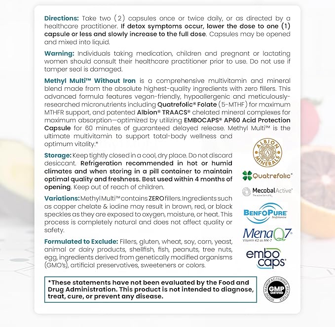 - πππππππ ππππππππππ: When supplementing, absorption is key! Methyl Multi without Iron is formulated with Quatrefolic Folate (5-MTHF), Albion TRAACS mineral chelates, and other micronutrients in their pre-methylated and coenzyme forms for optimal absorption and bioavailability, all together in patented EMBOCAPS AP60 acid resistant vegetable capsules designed for a guaranteed 60 minutes of acid-protection.