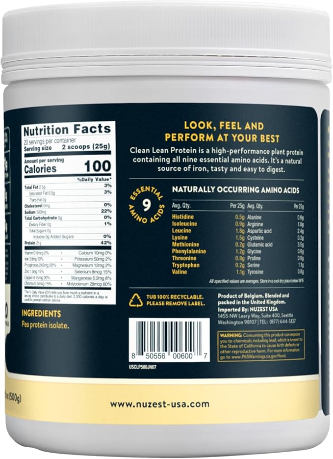 Nuzest - Pea Protein Powder - Clean Lean Protein, Premium Vegan Plant Based Protein Powder, Dairy Free, Gluten Free, GMO Free, Protein Shake, Just Natural (UNFLAVORED), 20 Servings, 1.1 lb