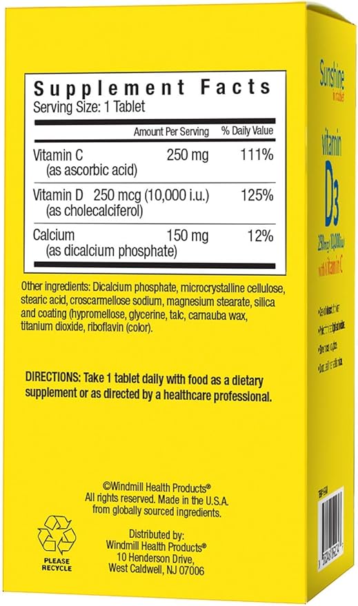 - ENJOY SUNSHINE THE EASY WAY β Each bottle of Sunshine Super Vitamin D contains 60 single serve tablets. Each contains 10,000 IU (250 mcg) of vitamin D and 150 mg of calcium and 250 mg of vitamin C.
