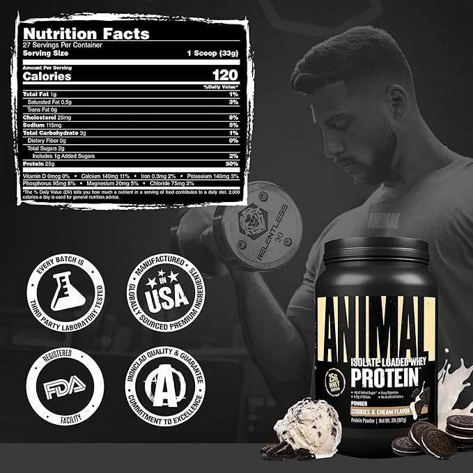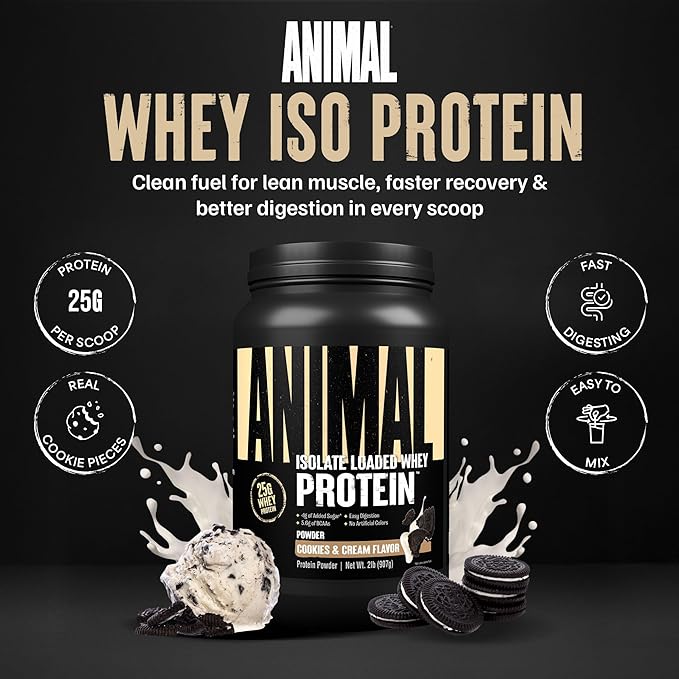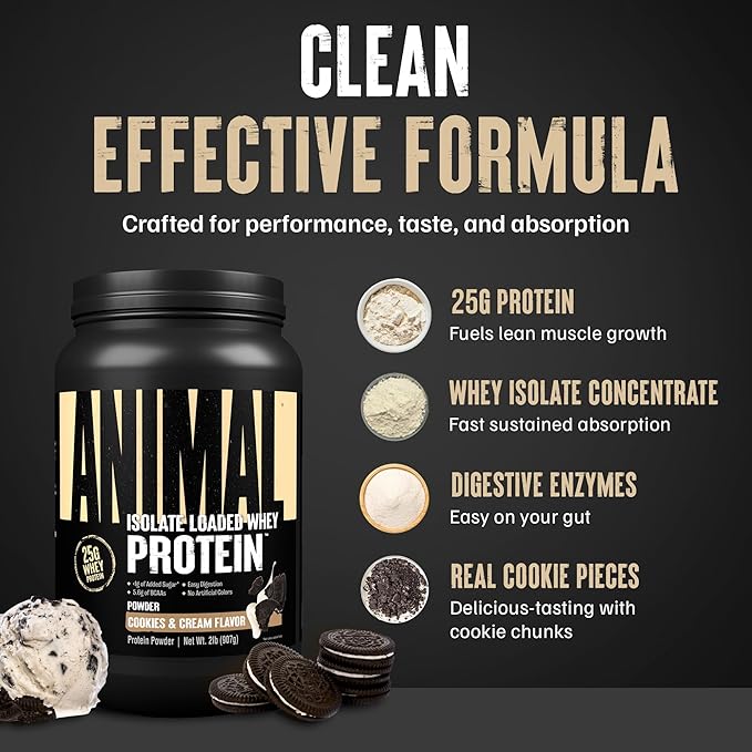 Animal Whey Isolate Protein Powder - Loaded for Pre & Post Workout Muscle Builder and Recovery with Digestive Enzymes for Men & Women - 25g Protein, Great Taste, Low Sugar - Cookies & Cream 2 lbs