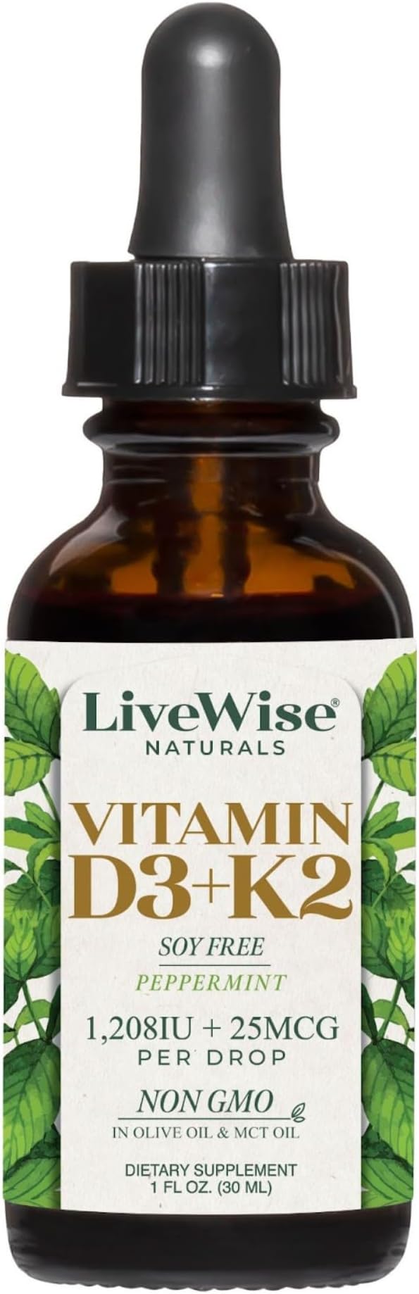 LiveWise Naturals Vitamin D3 with K2 Liquid Drops, All Natural, Non-GMO, USA Made, 1208 IU Vitamin D3 & 25 mcg K2, Supports Bone Health and Energy Levels, Infused with Peppermint, Olive, and MCT Oil
