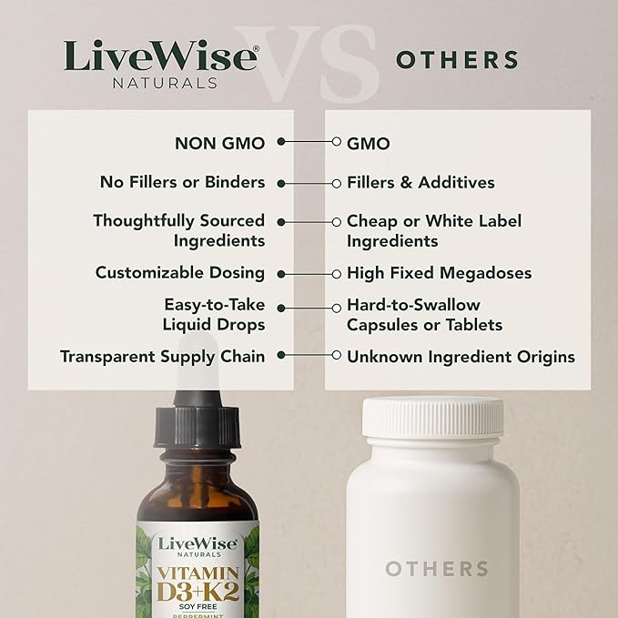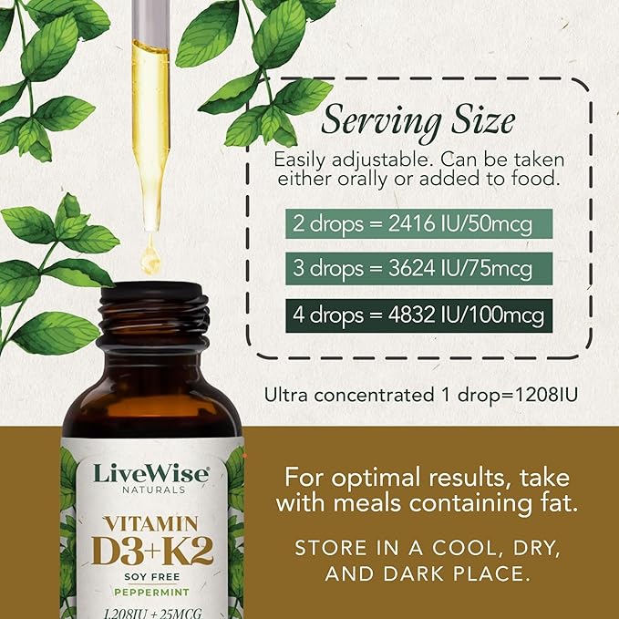 - ALL-NATURAL, NON-GMO, AND PURE: LiveWise Naturals Vitamin D3 with K2 Liquid Drops are made with all-natural, non-GMO ingredients, free from fillers, binders, or additives. This premium formula delivers Vitamin D3 (1208 IU) and K2 (25mcg) per drop to promote your wellness with maximum absorption and bioavailability.