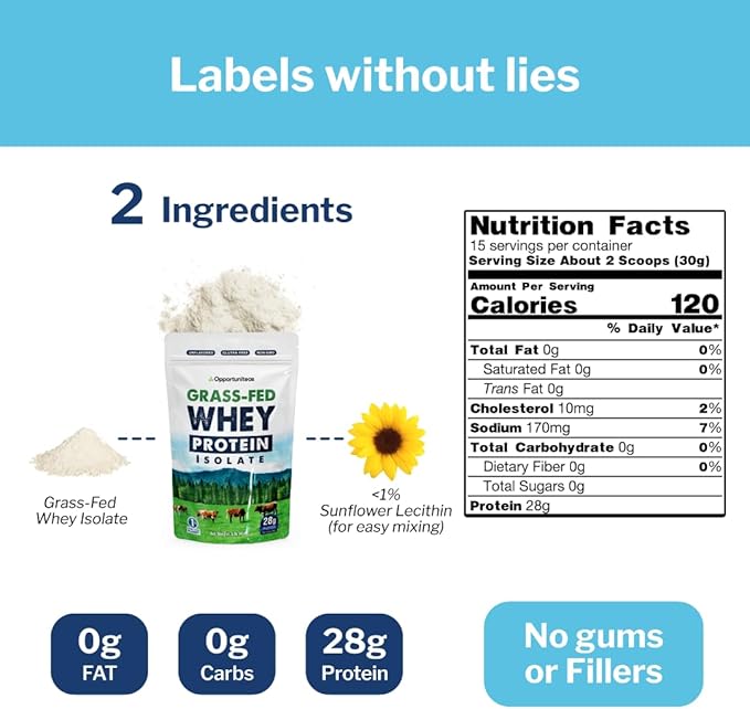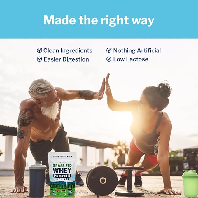Opportuniteas Grass Fed Whey Isolate Protein Powder - Unflavored 28g Protein Powder Without Artificial Sweeteners, Hormone-Free Cows, Non GMO - 1lb