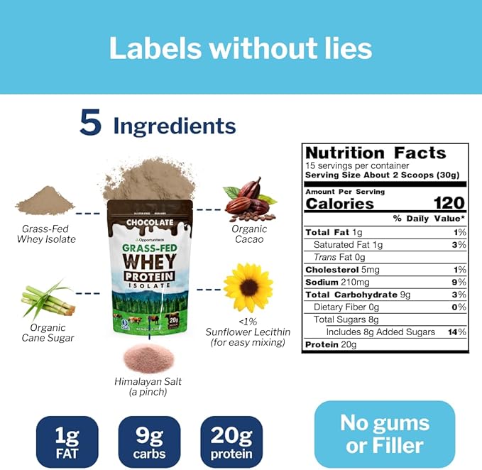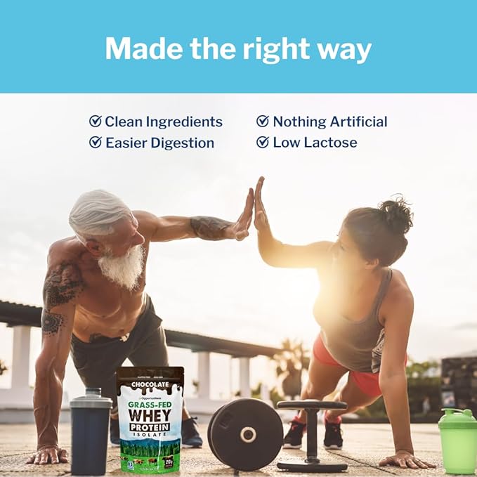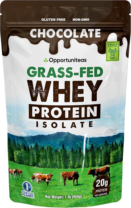 Opportuniteas Grass Fed Chocolate Whey Protein Isolate Powder - 20g Protein Powder Without Artificial Sweeteners, Hormone-Free Happy Cows, Non GMO - 1lb