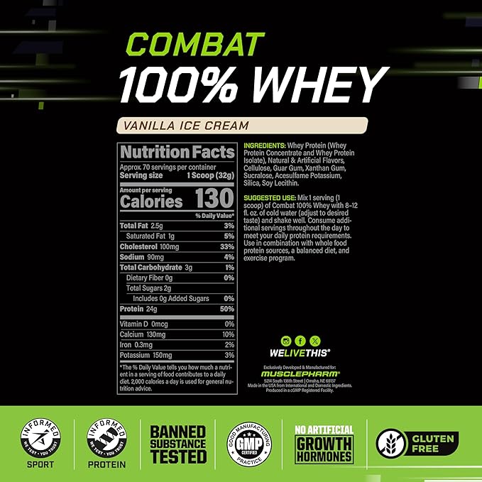 - Crafted by Experts, Delivered with Excellence: MusclePharm Combat 100% Whey is dye-free, gluten-free, banned substance tested and certified by Informed-Choice and Informed-Protein, so athletes can take it with confidence.