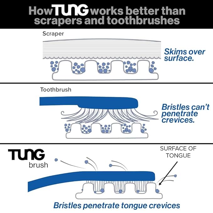 - COMFORTABLE AND EASY TO USE: The TUNG Brush is designed to reach the back of the tongue where odor hides; its wide head and ergonomic handle help reduce gag reflex; over time, any sensitivity fades with use; this BPA-free tongue cleaner makes it easy to stay fresh and adds reliable halitosis support to your oral care routine