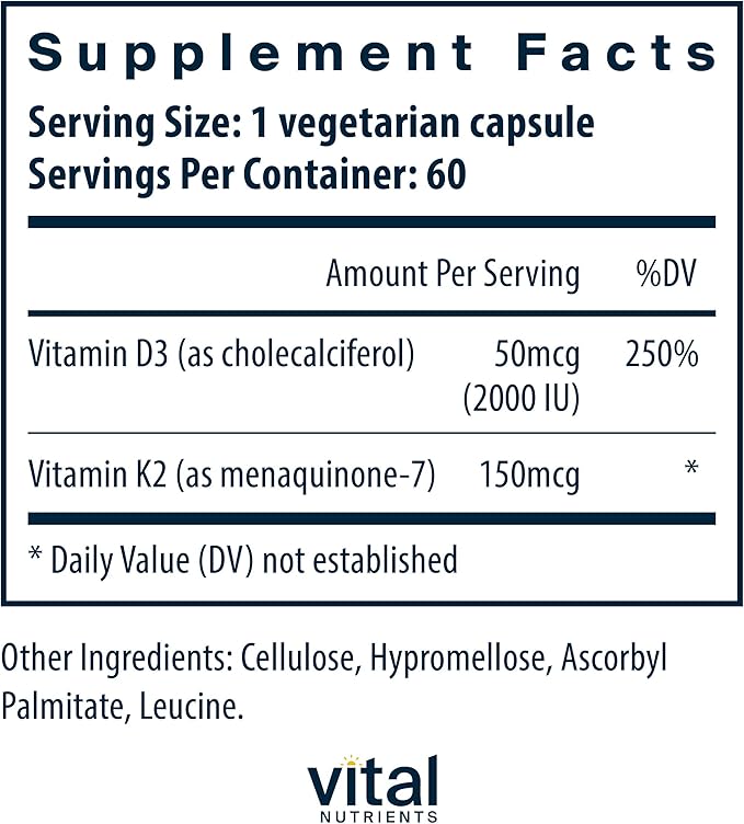 Vital Nutrients Vitamin D3 + K2 | 2000 IU | Vitamin D3 K2 Supplement | Vitamin D Complex for Healthy Calcium Levels, Muscle & Bone Health | Gluten, Dairy, Soy Free | 60 Capsules