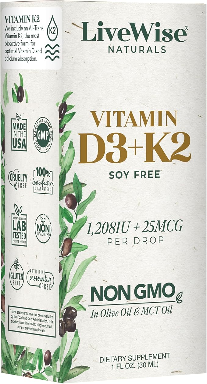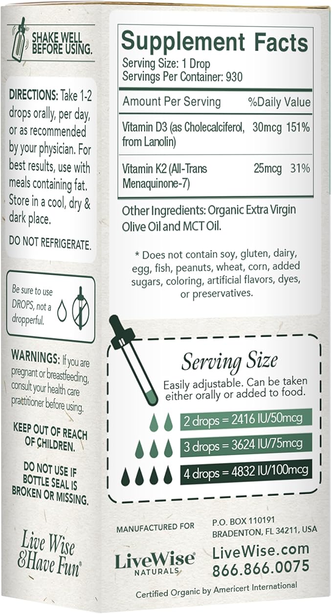 Vitamin D3 with K2 Liquid Drops, All Natural, Non-GMO, 1208iu D3 and 25mcg K2 (mk7) per Serving, Support Your Bones, Immune System and Energy Levels, with or Without Peppermint Oil