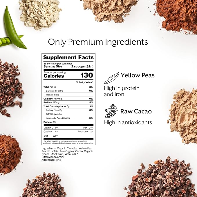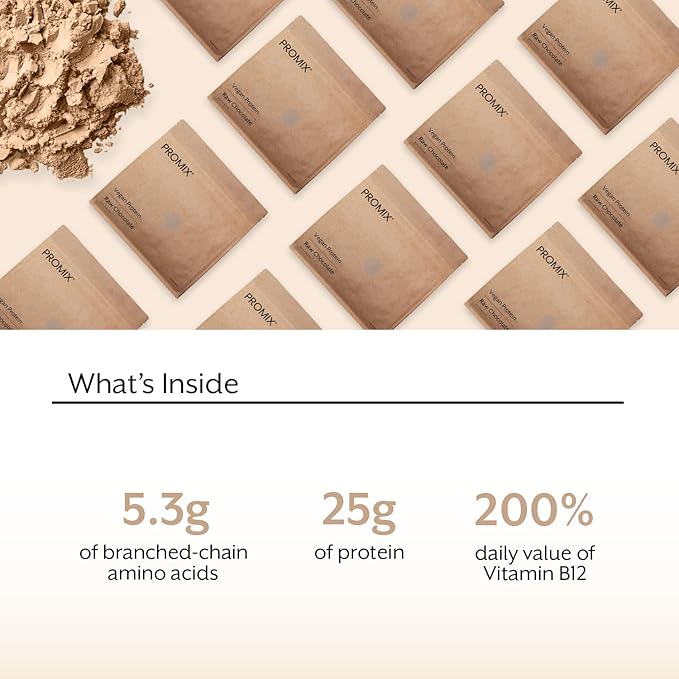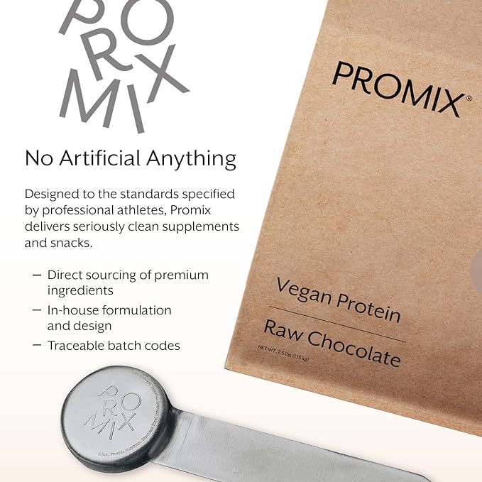 - Support Recovery and Build Muscle: Promix Vegan Protein Powder is a highly bioavailable vegan protein isolate made from organic Canadian yellow peas. This light- and smooth-tasting powder has a rich chocolate flavor and is lightly sweetened with monk fruit. Easy to digest and blend. Grown and processed in North America. Raw Chocolate flavor. 35 servings per container, 2 scoops per serving.