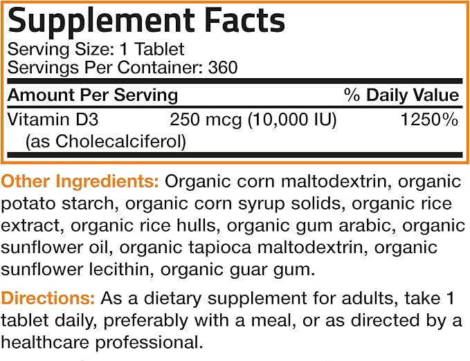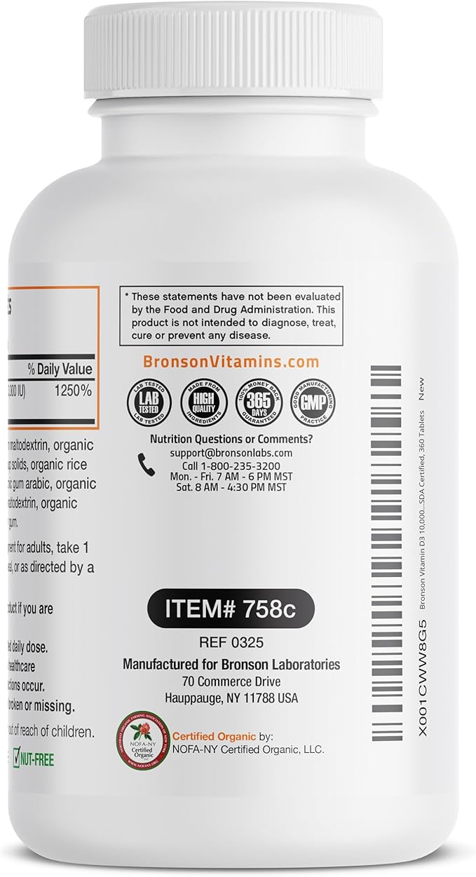 Bronson Vitamin D3 10,000 IU (250 mcg) Certified Organic High Potency Non-GMO Vitamin D Supplement, 360 Tablets