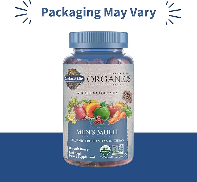 Garden of Life Organics Men's Gummy Vitamins - Berry - Certified Organic, Non-GMO, Vegan, Kosher Complete Multi - Methyl B12, C & D3 - Gluten, Soy & Dairy Free, 120 Real Fruit Chew Gummies