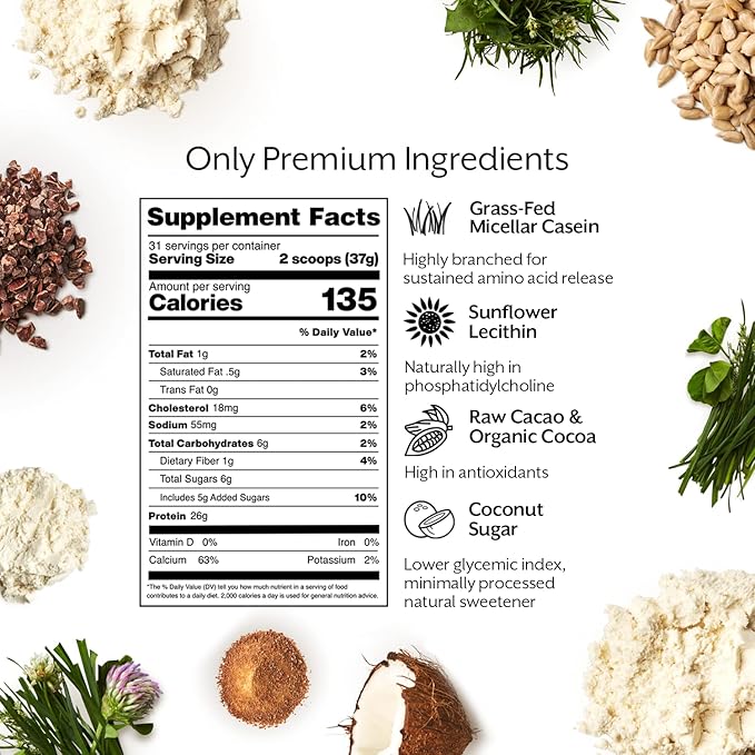 - Whole Food-Based Ingredients: Made of grass-fed micellar casein, sunflower lecithin (naturally high in phosphatidylcholine), raw cacao and organic cocoa (high in antioxidants), and coconut sugar (lower glycemic index, minimally processed natural sweetener). That’s it.