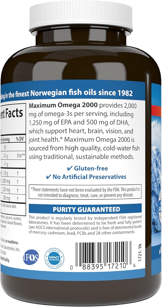 Carlson - Maximum Omega 2000, 2000 mg Omega-3s, Healthy Heart, Brain Function & Vision Support, Lemon, 90 soft gels
