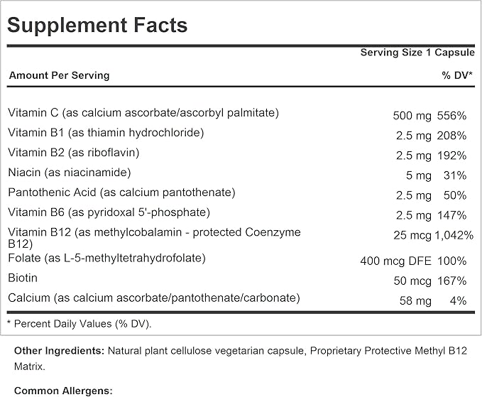 - Additive-free, natural complex of vitamin c plus all the essential b-complex vitamins - Delivers our unique absorption-protected Methylcobalamin (Natural Vitamin B12), and our metabolically active Folic Acid (Methyl Folate). The Vitamin C in this product is entirely in the form of a water-based mineral ascorbate (Calcium Ascorbate), which is entirely non-acidic, so it is guaranteed to not upset your stomach powerful anti-oxidant that supports the health of numerous body tissues and systems.