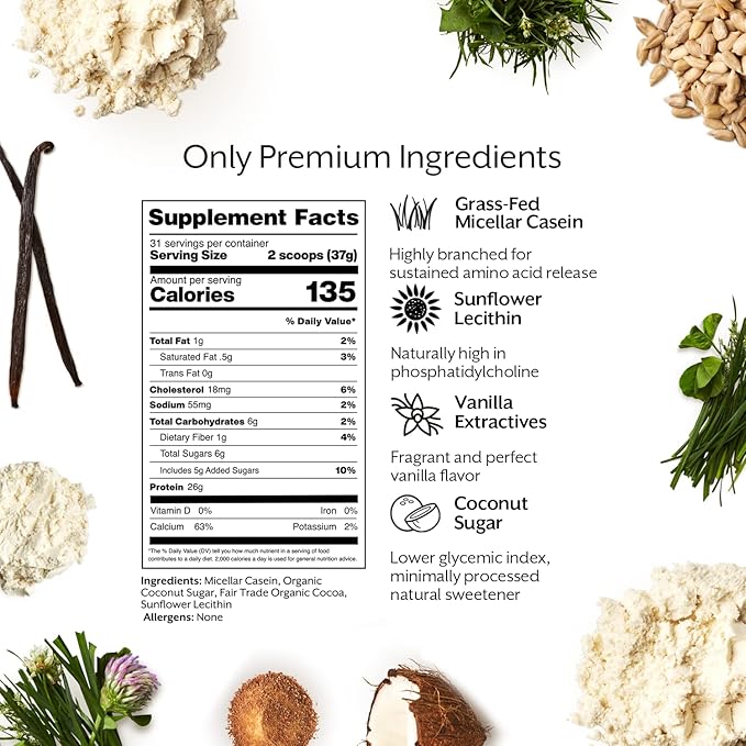 - Whole Food-Based Ingredients: Made of grass-fed micellar casein, sunflower lecithin (naturally high in phosphatidylcholine), vanilla extractives, and coconut sugar (lower glycemic index, minimally processed natural sweetener). That’s it.
