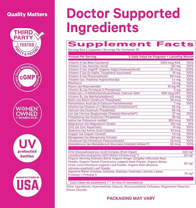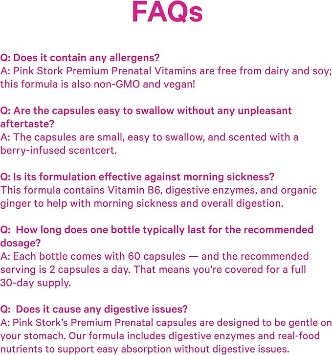 - Doctor-Formulated Prenatal for Women: Pink Stork Premium Prenatal Vitamin offers essential support for pregnancy, containing 100% of 21 OBGYN recommended nutrients and vitamins. PLUS prenatal-probiotics, organic and whole-food nutrient blends. Take two capsules daily as part of your prenatal ritual. 30-day supply.