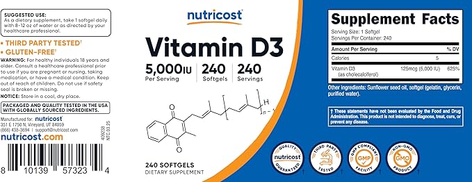 Nutricost Vitamin D3 5,000 IU (125mcg), 240 Softgels - Non-GMO and Gluten Free Vitamin D