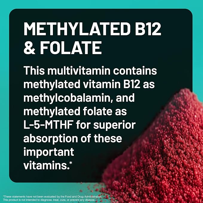 - METHYLATED B12 & FOLATE: This multivitamin for women contains methylated vitamin B12 as methylcobalamin, and methylated folate as L-5-MTHF for superior absorption of these important vitamins.*