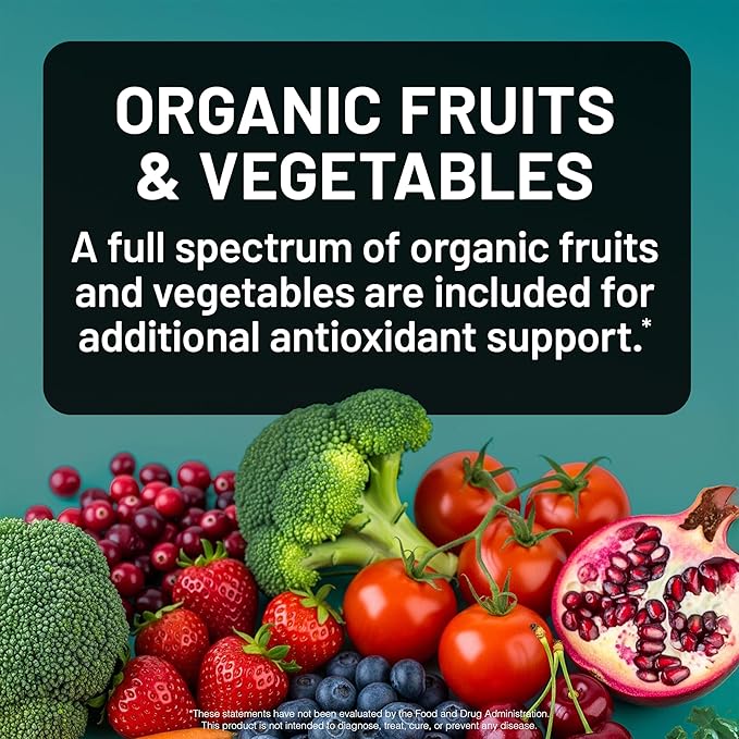 - ORGANIC FRUITS & VEGETABLES: A full spectrum of organic fruits and vegetables are included for additional antioxidant support, including organic: cranberry, strawberry, raspberry, broccoli sprouts, spinach, kale, & more.